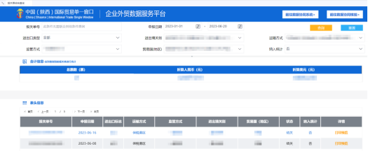 进入中国(陕西)国际贸易单一窗口大数据分析平台,在左侧菜单区域点击“数据协同核验”-右侧区域的“报关单综合查询”进入之后,设置查询条件:申报日期区间、纳入统计(设置“否“),点击”查询“按钮,查看是否存在不纳入统计范围内的报关单,若存在,则下方区域会列出未纳入统计范围报关单的详细信息,供企业进行核对,如下图所示: